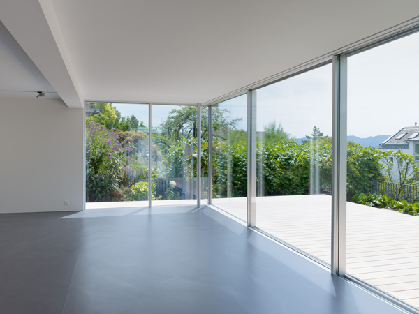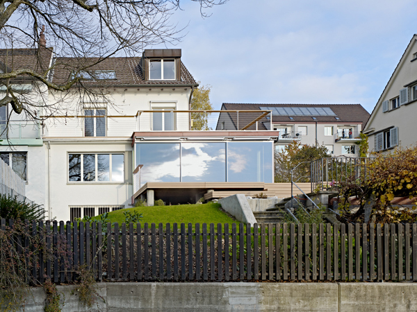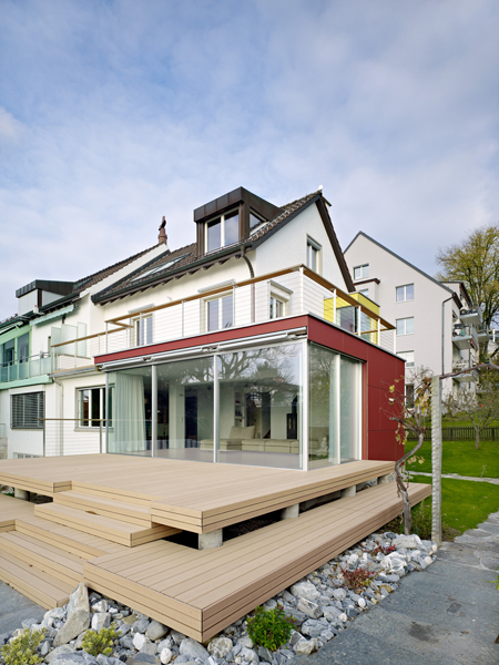 Die Wohnraumerweiterung schiebt sich als Neubauteil in das bestehende Gebäude. Die Stütze im Rauminnern markiert den alten Fassadenverlauf. Sie ist nicht nur statisch begründet, sondern verkleidet auch zahlreiche haustechnische Leitungen für die Obergeschosse. Zugleich unterteilt sie den über 60 m2 grossen Raum in einen Ess- und Wohnbereich.
