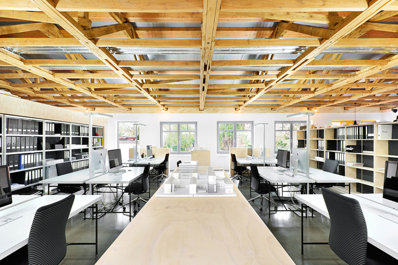 Die erdgeschossige, in einem Hinterhof gelegene freispannende Halle wird für die neue Nutzung entrümpelt und strukturell überarbeitet. Teeküche und Toiletten werden neu fest eingebaut. Die gesamte haustechnische Infrastruktur wird erneuert. Ziel der Umbaumaßnahme ist der Erhalt des Werkstattcharakters. Auf Fußbodenbelag und homogen durchlaufendem Industrieestrich werden die von den Architekten entworfenen Möbel als mittiges Band in der Halle platziert. Alle Verkehrswege werden an den Außenwänden platziert. Das Möblierungskonzept ermöglicht jederzeit die variable Umstellung der Arbeitsplätze für individuelle Teambildungen für entsprechende Projektaufgaben. Die Innenraumgestaltung ist weitgehend industriell gehalten.