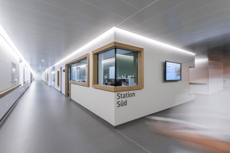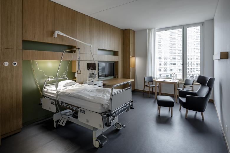 Der siebenstöckige Neubau umfasst 280 stationäre Betten in 176 Patient*innenzimmern. In jedem der vier Obergeschosse des Spitalkomplexes sind zwei Pflegestationen untergebracht, ganz oben befindet sich die Privatabteilung. Das spitaleigene, ergonomisch gestaltete Therapiebad und die Therapiegärten ermöglichen weitreichende Rehabilitationsmassnahmen. Einladende Gemeinschaftsräume sowie der auf einer Zwischenebene angelegte Dachgarten bieten Möglichkeiten der Erholung und Begegnung.