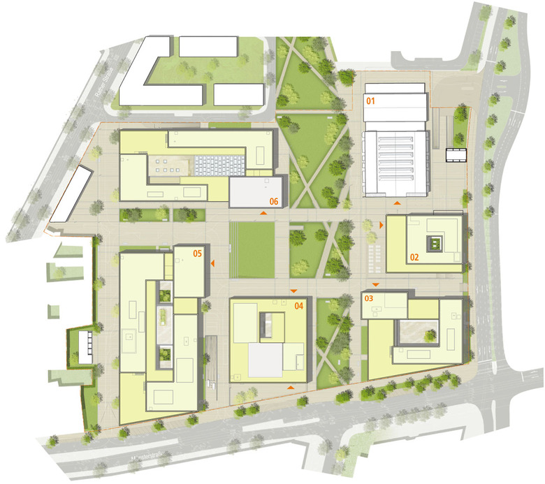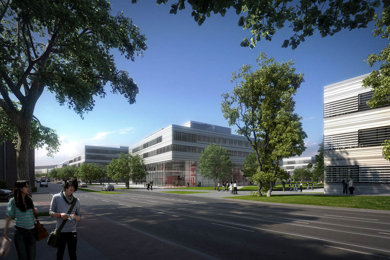 Die Außenanlagen ergänzen die ruhige, klar gegliederte räumliche Ordnung des Städtebaus. Zentrum der Kommunikation im neuen Quartier ist der Campusplatz mit dem in Nord-Süd-Richtung verlaufenden Grünzug als grünem Herz des Hochschulgeländes.