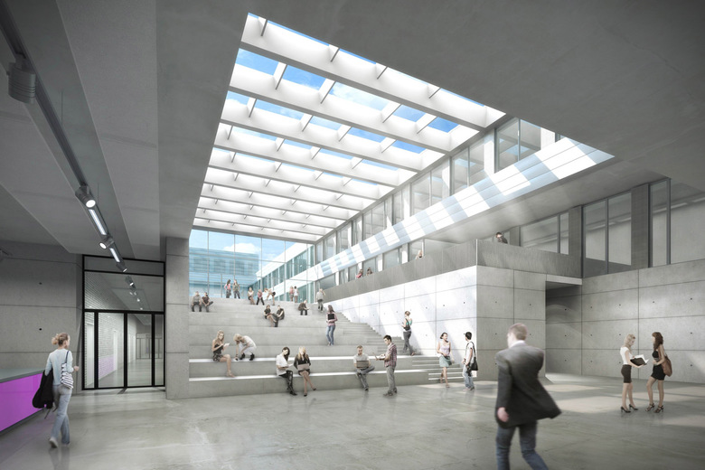 In jedem der Fachbereichsgebäude sind zwei Fachbereiche untergebracht, die sich das jeweilige, zum Campusplatz orientierte Eingangsbauwerk – den sogenannten Kopfbau – und gemeinsame Funktionen teilen. Die großzügigen Treppenanlagen darin laden zum Verweilen ein und bieten Raum für Austausch und Begegnung. Flexible Nutzungsmöglichkeiten für beispielsweise Cafés und Ausstellungen verleihen den Fachbereichsgebäuden ihre jeweils eigene Identität.