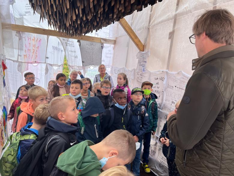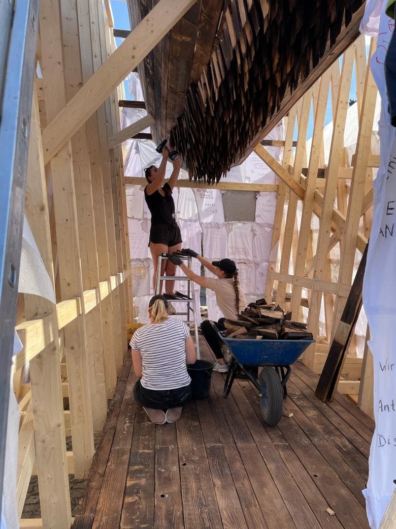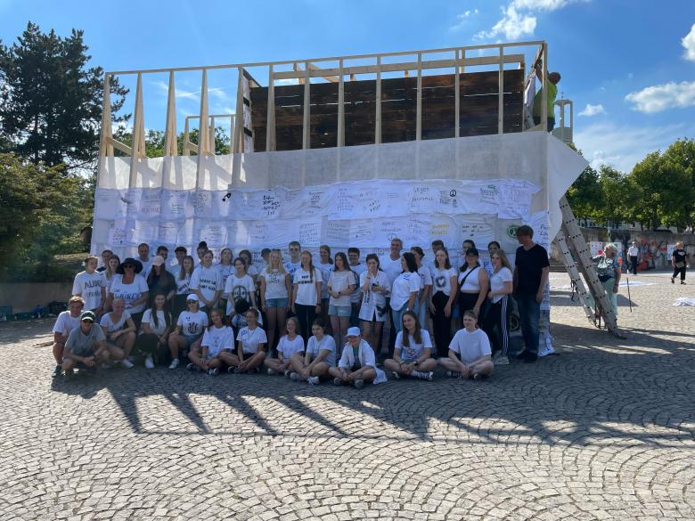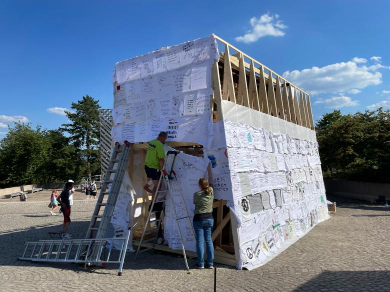 More than three thousand schoolchildren, students and citizens took part in the installation and worked together in the occasion of preparatory workshops in schools, during the construction at the central square of Kassel Friedrichsplatz and had many open discussions with the artists and visitors of documenta fifteen.