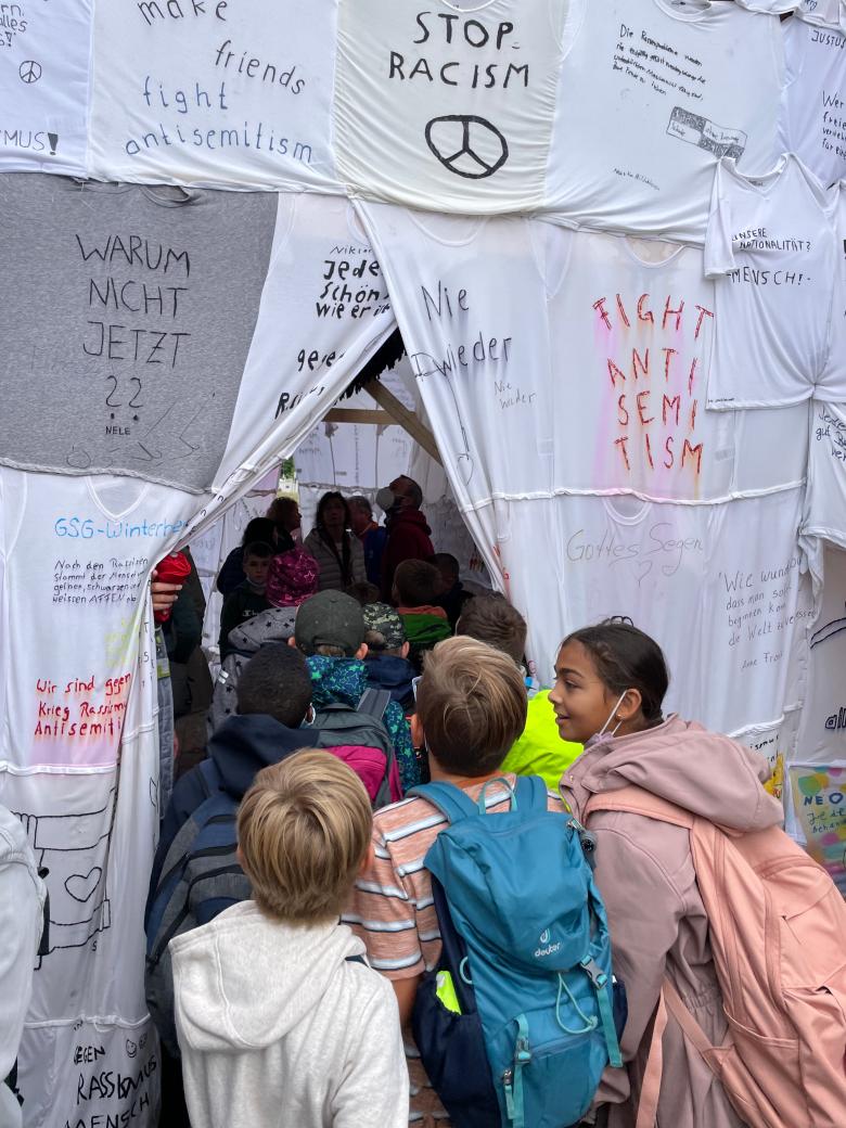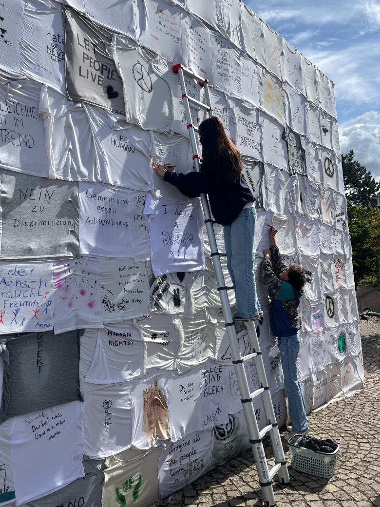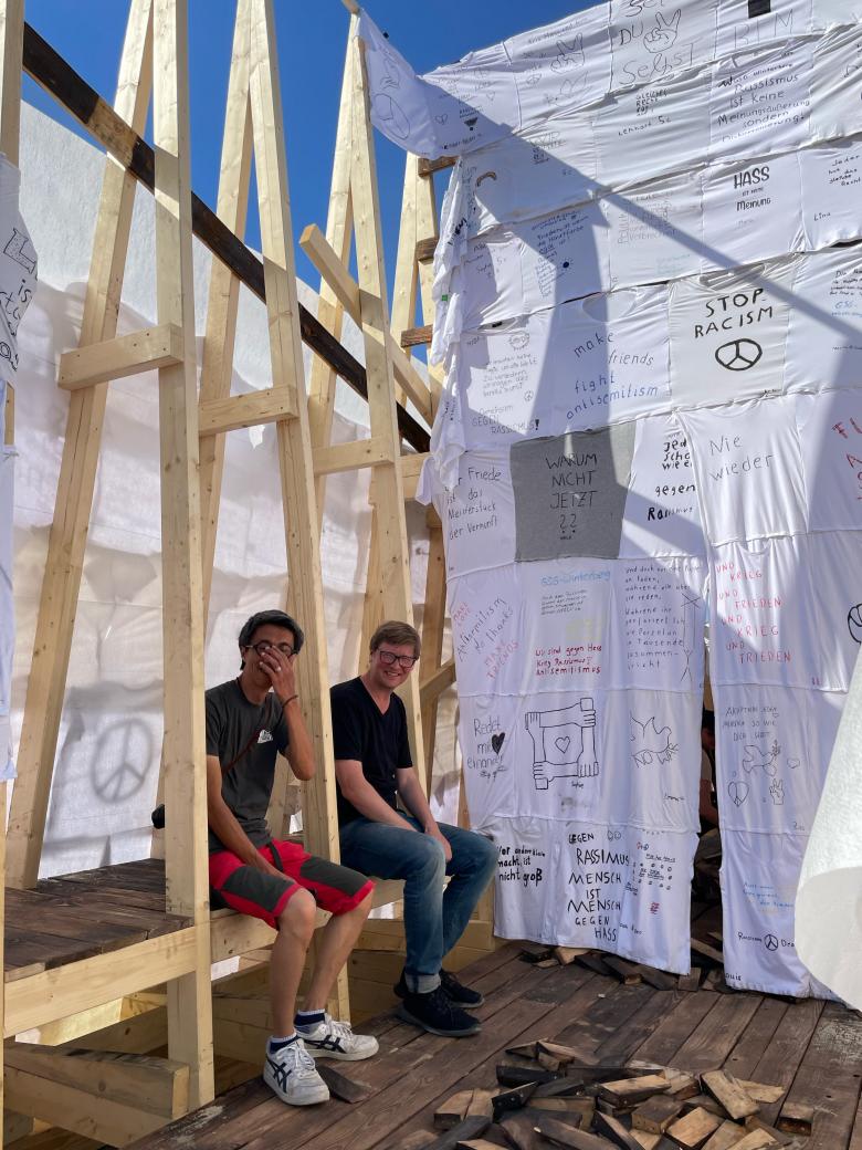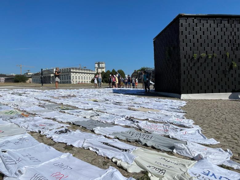 Voices is a collective installation against any form of hate and discrimination. It is a direct, bottom-up reaction to the anti-Semitism scandal of documenta fifteen, the world art exhibition that takes place in Kassel every five years. Everyone was invited to contribute by formulating a message of tolerance, acceptance, and solidarity. In fact, the outer shell of the pavilion consisted of hundreds of T-shirts with different statements designed as Voices of resistance against hate and discrimination and for love, hope, and tolerance.