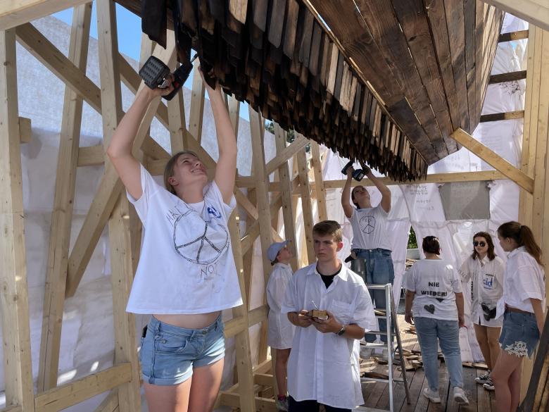 Inside, many sharp-edged pieces of wood formed a large, dark wedge. They symbolized the countless messages of hate that are being spread around the world every day, separating people from one another. These millions of hate messages can end up becoming a dangerous and heavy force, which the massive wedge stands for.