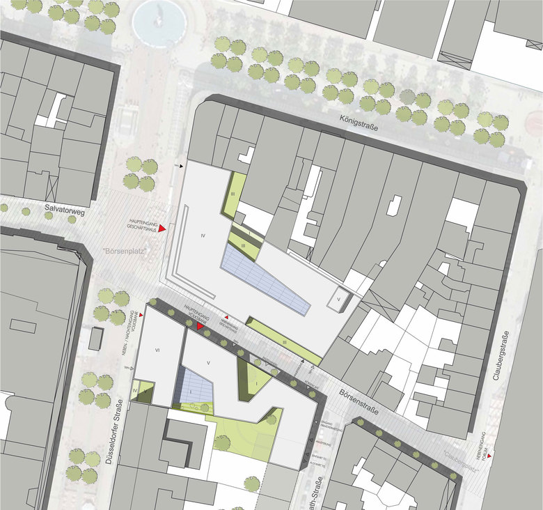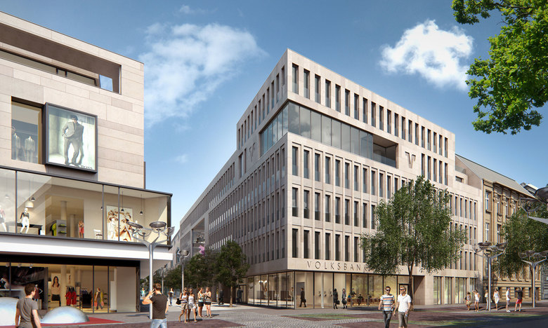 Mit dem Neubau der Hauptstelle der Volksbank Rhein-Ruhr eG besteht die einmalige Chance, in diesem Teilbereich der Düsseldorfer Str. das historische Straßenprofil wieder herzustellen und damit eine höhere Aufenthaltsqualität in bester Einkaufslage zu schaffen. Die neu formulierte Gebäudeecke der Volksbank setzt einen städtebaulichen Akzent und betont an dieser Stelle die angestrebte Wegeverbindung durch die Börsenstraße zum Forum. Zusätzlich stärkt sie die Verknüpfung von Salvatorweg und Börsenstraße. Damit wird die Lauflage zwischen Forum und Wallquartier spürbar aufgewertet. Der geplante Neubau der Volksbank stellt einen mäandrierenden Gebäudekörper dar, der sich an der vorhandenen Blockstruktur orientiert. Durch seine vor- und zurückspringenden Bewegungen schafft er kleine qualitätvolle Innenhöfe und somit immer neue Blickbeziehungen, viel Tageslicht und kurze Wege für die Mitarbeiter. Die Eckbetonung an der Düsseldorfer Straße / Börsenstraße bildet einen Auftakt, zur schmaleren Börsenstraße ist die Geschossigkeit reduziert und berücksichtigt damit die dortige Bebauung. Die Fassade des Bankgebäudes stellt eine zeitgemäße Fortführung der denkmalgeschützten Nachbargebäude dar. Im Detail wird bei der plastischen Durcharbeitung der Natursteinfassade in sehr reduzierter Form Bezug genommen auf das Signet des Bauherrn.