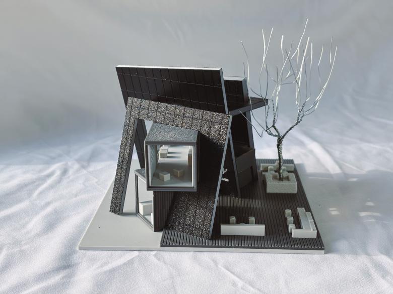 The external staircase is embedded at an angle in the gap between two walls, embodying the spatial narrative of upward exploration through cracks. Structurally, an additional horizontal steel frame installed on top of the original container secures the staircase to the main building, while also serving as a rain shelter. Air conditioning outdoor units are concealed within this frame to prevent equipment exposure from compromising facade integrity, thus achieving an integrated design that unifies structure, function, and aesthetics.