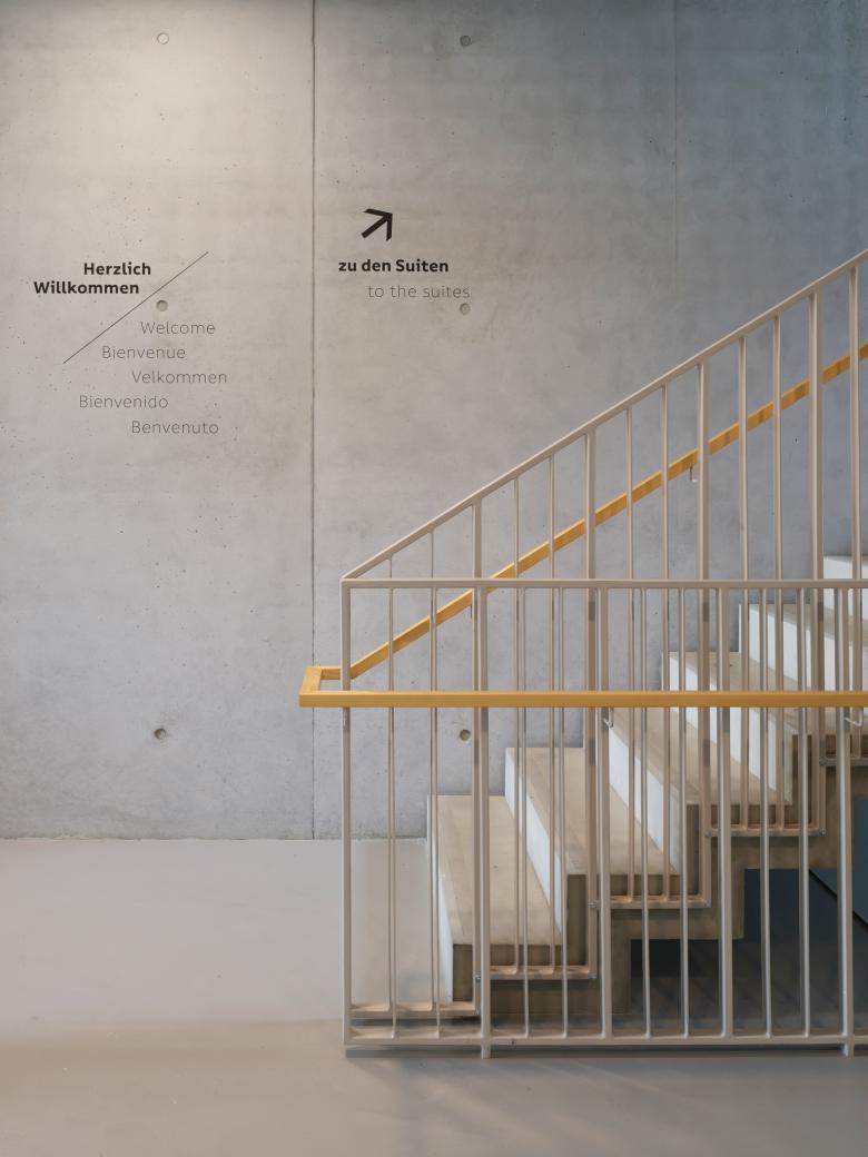 Die tragende Außenwand des Hauses besteht aus gezielt eingesetzten vorgefertigten Betonfertigteilen, deren eindrucksvolle Montage auch eine beschleunigte Bauzeit erlaubte. Die Fertigteile besitzen trotz ihrer tragenden Funktion großflächige Fensteröffnungen mit integriertem elektrisch bedienbarem Sonnenschutz. Diese Fenster, wie auch die angrenzenden Glaselemente bestehen aus massiver Weißtanne, welche nicht nur ein spannendes Pendant zu den glatten und harten Sichtbetonoberflächen der Betonfertigteile darstellt, sondern auch im Innenraum der Wohnungen zusammen mit den Holz-Parkettböden zu einer warmen und freundlichen Wohn-Atmosphäre führt.