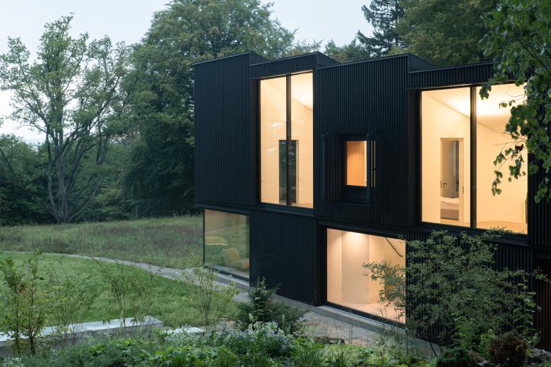 This family home expresses its inner life, its context of seasons, light, and surroundings in a simple architectural figure. Conceptionally, it distinguishes between private rooms and a generous open space for daily family life. All private rooms are artistically composed to a sculpture of wooden cubes in between which the open space can unfold horizontally and vertically, bringing in light deep into the house - even in winter - as well as drawing views into the garden, the treetops, and across the lake from any vantage point.