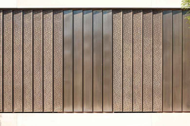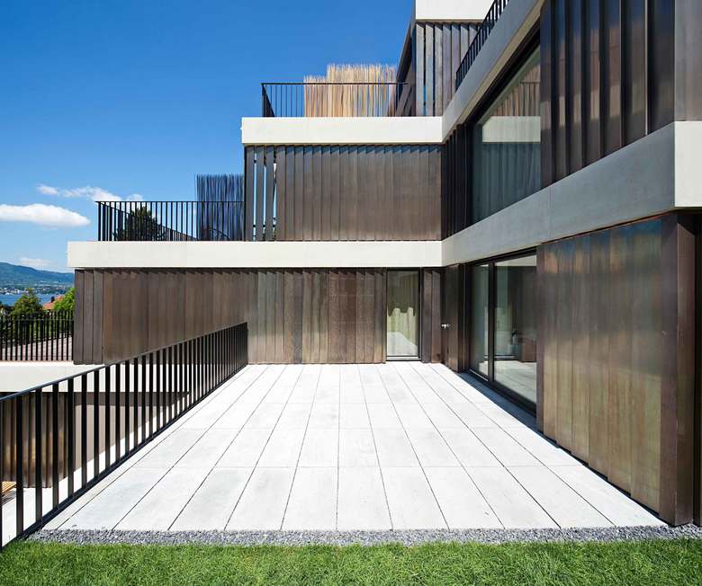 mit verdrehten, vertikalen Messing Schuppenbleche vermittelt Bewegung in der Fassade. Um die Weitsicht zu verbessern wurde im UG und EG eine Einliegerwohnung eingebaut . Durch diese Massnahme werden die Haupträume nach oben geschoben und verbessern die Aussicht
