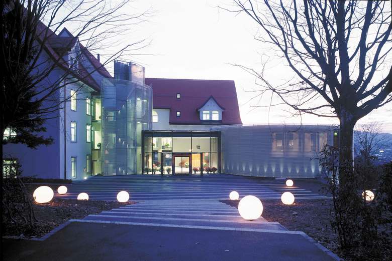 Dem Entwurf des Büros Schwarz und Schwarz liegt die Idee einer deutlichen Trennung von Alt und Neu zugrunde. Neu sind ein linsenförmiges Auditorium mit 120 Sitzplätzen und ein gegenüberliegender Treppen- und Liftturm, die den Eingang auf der Rückseite des Gebäudes rahmen sowie der geschwungene Restaurantpavillon, der auf der Vorderseite über dem Rebberg ruht. Die Neubauten sind bewusst nicht als angepasste oder untergeordnete Annexbauten konzipiert, sondern als eigenständige Elemente. Sie sind mit einer filigranen Lamellenstruktur verkleidet, ausser dort, wo sie voll verglast sind. Im ersten Moment mag der ausgeprägte Kontrast zwischen der denkmalgeschützten Fassade des Hotels Sonnenberg und den gerundeten, metallischen Kuben der Neubauten überraschen. Aber er überzeugt auch. Denn gerade das Nebeneinander alter und neuer Gebäudeteile verleiht dem Umbau sein charaktervolles Gesicht. Mit der Verlegung des Haupteingangs von der linken Seitenfassade auf die Rückseite schufen die Architekten ein neues »Eingangsgesicht«, das dem Gebäude zusammen mit dem grosszügigen Vorplatz, dem luftigen Entrée und der Alt-Neu-Komposition Eigenständigkeit und einen Signalcharakter verleiht.