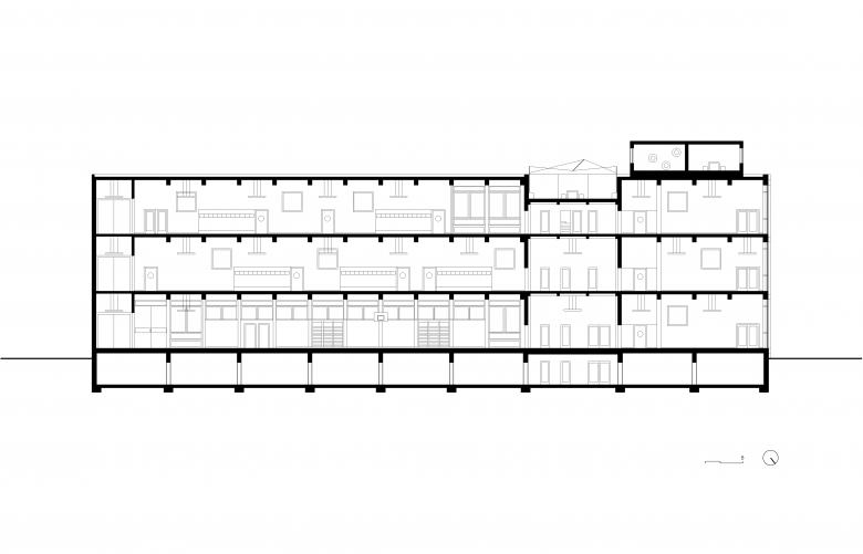 Für den Umbau setzten die Architekten auf einfache und kostengünstige Konstruktionen. Die Turnhalle zum Beispiel besteht aus Ständerwänden, die nur auf einer Seite beplankt wurden, sodass die Konstruktion an der Aussenseite sichtbar bleibt, wohingegen die Innenseite eine glatte Oberfläche hat. Sie ist in Rosa gestrichen – einer Farbe, die an Zuckerwatte