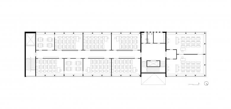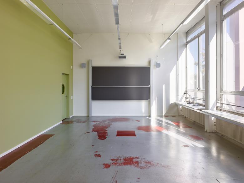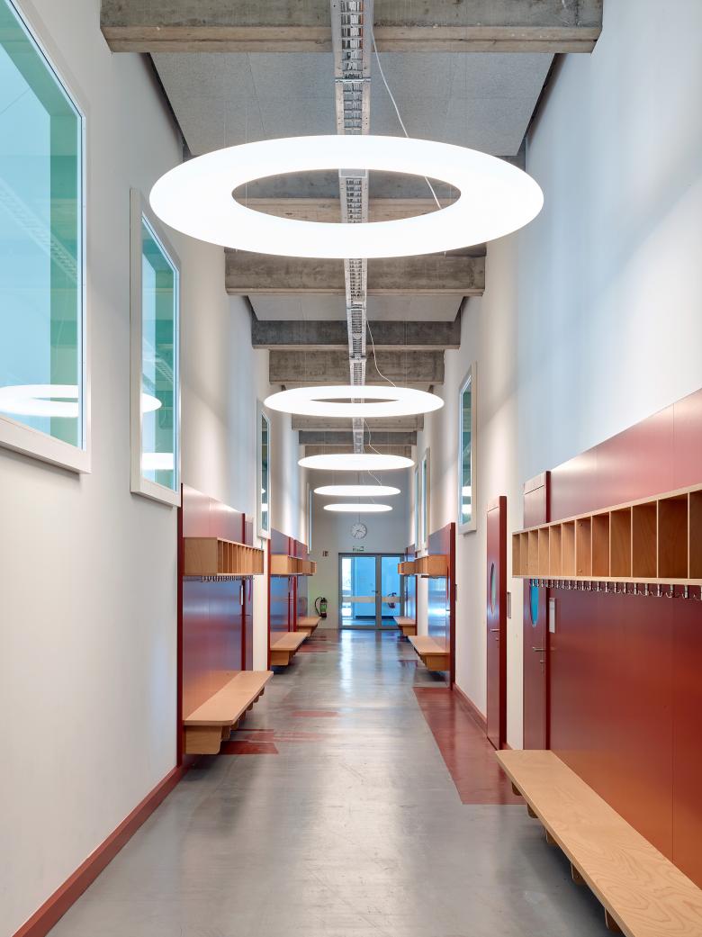 Farbkleckse wurden gescannt, vergrössert und an ausgewählten Stellen appliziert. Kunstgriffe wie diese waren günstiger als Malerarbeiten. Das Ergebnis ist eine Schule mit besonderer Atmosphäre. Statt eines edlen Innenausbaus zeigen die unprätentiösen Räume die Spuren der Vergangenheit. Aus einer Fabrik wurde eine Werkstatt des Lernens.