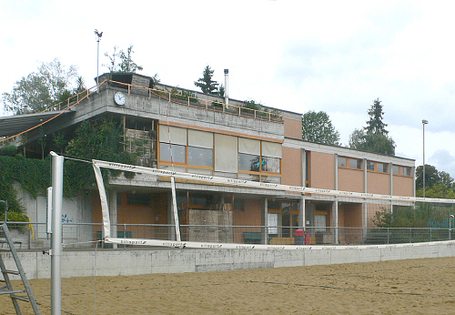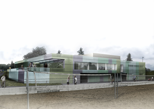 Das massive, etwas schwerfällig anmutende Garderobengebäude aus den 70-er Jahren mutiert zum lichten Pavillon mit Restaurant und Garderoben in einer Landschaft von Sportanlagen.