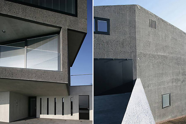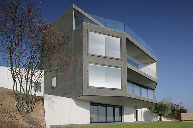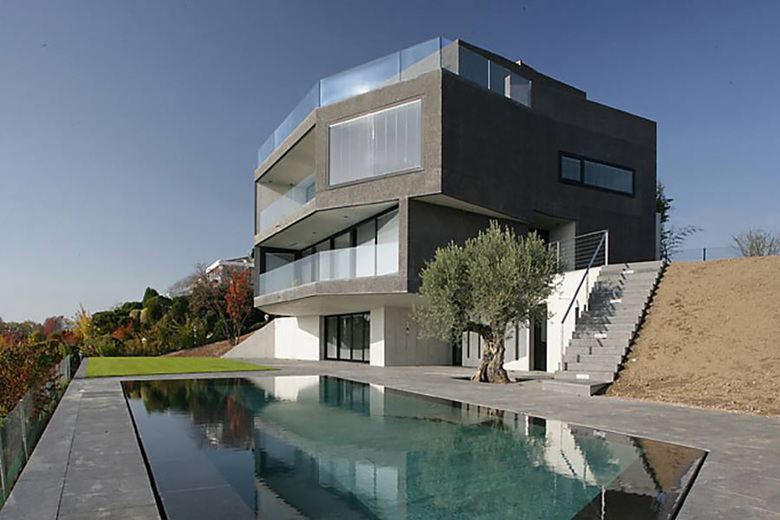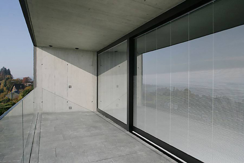 Alle Fronten und die Arbeitsfläche der Küche sind aus Corian. Dieses hochwertige Material wurde auch bei den Waschbecken in den Badezimmern eingesetzt. Die Aussenfassade der Villa besteht aus eingefärbtem und anschliessend gekratztem Beton. Die Dachschrägen wurden betoniert und mit Kupferblech ausgekleidet. Bei den Verglasungen tasteten wir uns an das Limit des technisch Machbaren heran. So wurden ins Glas der riesigen Fenster Storen integriert, die per Knopfdruck den Blick auf ein sensationelles Panorama freigeben.