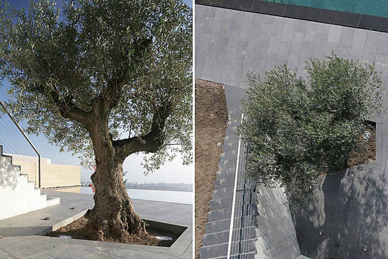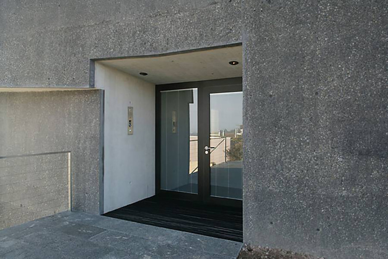 Die Villa wird über einen dem Haus vorgelagerten Innenhof betreten. Hier empfängt den Besucher ein Wasserspiel, dessen meditatives Ambiente den Gast auf das Eintreten in die Villa einstimmt. Die Höhe der Hofmauer lässt keine Einblicke vom daneben liegenden öffentlichen Weg zu. Vom Innenhof aus hingegen überschaut man die Nachbarschaft und fühlt sich nicht eingeengt. In die Hofmauer ist eine vom Architekten entworfene, metallene Skulptur eingelassen. Bei Dunkelheit ist diese Skulptur hinterleuchtet und wirft ein zauberhaftes Licht auf den Innenhof.