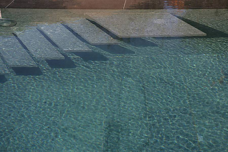 Bei den Materialien wurde auf ein Minimum an Auswahl und ein Maximum an Qualität gesetzt. Wengé-Parkett für den Fussboden, in den Nasszellen Travertin an Boden und Wänden. Dann wieder Wengé für die vom Architekt entworfenen Badezimmermöbel. Im Aussenbereich kam ein dunkler Basaltstein zur Anwendung. Der Pool ist mit Andeer-Granit ausgekleidet, was ihm das Aussehen eines natürlichen Bergsees verleiht.