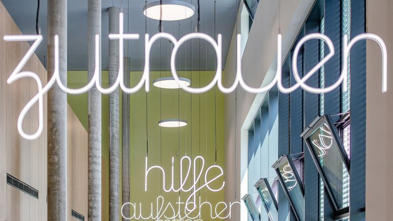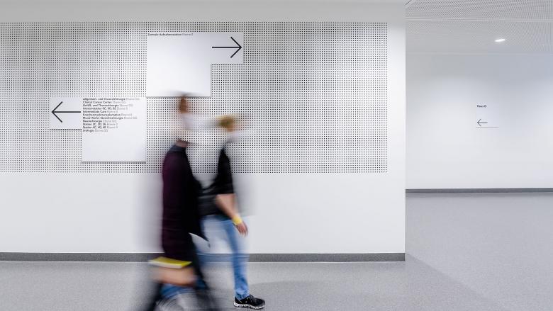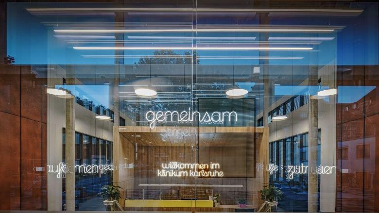 Mit der Eingangshalle wird ein zentraler Identifikationsort geschaffen. Sämtliche Gebäude werden von hier aus erschlossen. Imageprägend wirkt die „Kunst am Bau". Leuchtende Begriffe, auf die Arbeit im Krankenhaus bezogen, begrüßen alle Ankommenden, wecken Emotionen und versuchen die Ängste und Sorgen zu würdigen. Die Graphik, Farbigkeit und Signaletik, die in Zusammenarbeit mit Andreas Uebele, Kommunikationsdesigner, Harald F. Müller, Künstler und Hannes Böhringer, Philosoph, entwickelt wurde, geben dem Haus seine individuelle Ausstrahlung.