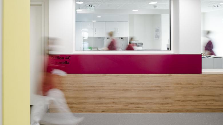 Die Stationsgrundrisse sind hintereinander in einem langen Riegel angeordnet und von der städtebaulichen Form beeinflusst. Dies ermöglicht den Patientinnen und Patienten eine leichte Orientierung und dem Stationspersonal optimale funktionale Bedingungen. Je nach Bedarf können Stationen getrennt oder zusammengeschlossen werden.