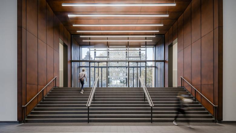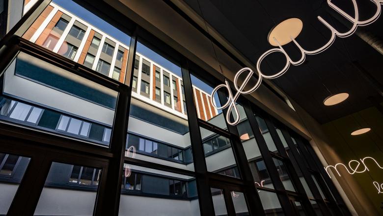 Taktgebend für die stadträumlichen Entwicklungsachsen des Neubaus war die zum Teil unter Denkmalschutz stehende Anlage des Klinikums. Das „Haus M" verbindet alle angrenzenden Klinikzentren mit einer zentralen identitätsstiftenden Magistrale. Der städtebauliche Charakter wird in seiner Durchlässigkeit erhalten, verschiedene Höhen, Proportionen und Materialitäten miteinander in Einklang gebracht.