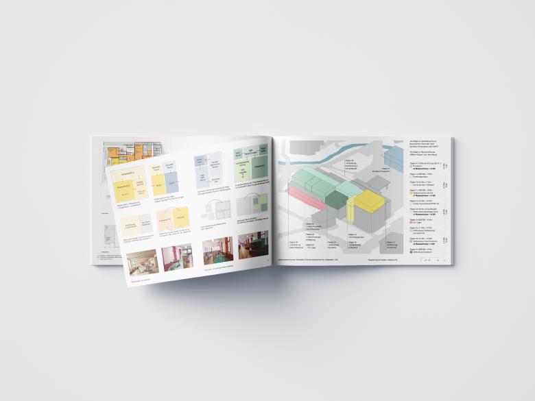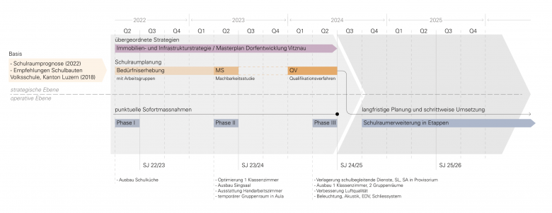 Die Massnahmen gliedern sich in drei Etappen: kurzfristige Sofortmassnahmen wie ein temporäres Schulprovisorium und flexible Möblierungslösungen, mittelfristige Rochaden mit Nutzungsverlagerungen innerhalb der vorhandenen Raumstruktur nach dem Auszug der Feuerwehr sowie langfristige bauliche Erweiterungen. Dazu wurden Möglichkeiten für Aufstockungen, Anbauten und ein zusätzliches Fluchttreppenhaus, das eine Lernlandschaft im Korridor ermöglicht, geprüft. Die Etappierung erlaubt es, flexibel auf den Bedarf zu reagieren und komplexe zeitliche und funktionale Abhängigkeiten zu berücksichtigen.