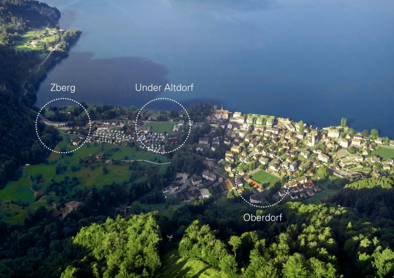 Zentraler Bestandteil der Studie war die Standortevaluation. Drei gemeindeeigene Grundstücke wurden hinsichtlich ihrer Eignung für einen Neubau mit je einer Machbarkeitsstudie überprüft: Oberdorf, Under Altdorf und Zberg. Die Standortprüfung war eine gezielte Vertiefung innerhalb des übergeordneten Entwicklungsprozesses «Masterplan Dorfzentrum Vitznau». Ziel war es, die dort formulierten Stossrichtungen für die Quartiere einzubeziehen und die Erkenntnisse wieder in die Masterplanung zurückzuführen. Die Studien untersuchten auch mögliche Zusatznutzungen mit Potenzial für Mehrwert im Quartier, etwa Sportplatz, Parkierung, Wohnen oder Gewerbe. Damit stärkt die Standortevaluation die strategische Ausrichtung des Masterplans.