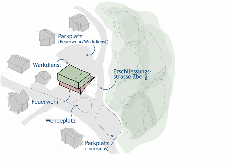 Begleitet wurde der Prozess durch ein Gremium aus Gemeindevertretenden, kantonalen Stellen und den Nutzergruppen Feuerwehr und Werkdienst. Rückmeldungen aus der Bevölkerung flossen im Rahmen des Mitwirkungsmonats zum Masterplan ein. Die Entscheidung erfolgte anhand einer Bewertungsmatrix mit vier Oberkriterien: Gesellschaft (Einbindung und Nutzung), Raum (Eingliederung und rechtliche Rahmenbedingungen), Wirtschaft (Synergien und Kosten) sowie Umwelt (Nachhaltigkeit und ökologische Auswirkungen). Der Standort Zberg schied aufgrund der Naturgefahren aus. Nach einer vertieften Auseinandersetzung mit den verbleibenden Optionen fiel die Wahl auf den Standort Oberdorf. Auf der Grundlage der Machbarkeitsstudie wird nun ein qualitätssicherndes Planungsverfahren für den Neubau vorbereitet.