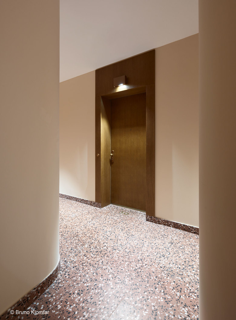 In the interior, unique parts of the original design such as a marble clad staircase with its 1960s handrail made of gold-coloured cast aluminium were carefully refurbished. It is now possible to experience the elegant charm of the 1960s in these areas.