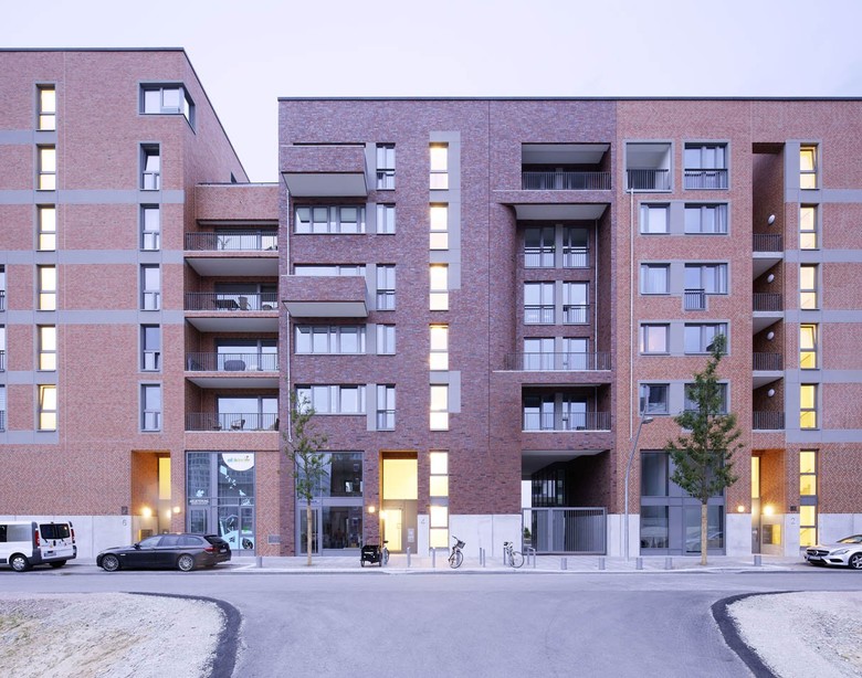 Für die Umsetzung der Materialvorgabe „roter Ziegel“ dient als Referenz die neobarocke Architektur Hamburgs, wie z.B. das HHLA-Gebäude in der Speicherstadt, die mit ihrem Spiel von Ziegel und Naturstein besonders geeignet zu sein scheint, ein gleichermaßen anspruchsvolles wir wohnliches Ambiente zu erzeugen.