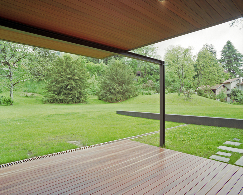 Il progetto riguarda il restauro e l’ampliamento di una casa di inizio novecento, il disegno degli spazi aperti e del parco con l’inserimento di una nuova autorimessa nella collina. L’ampliamento della casa principale ha modificato radicalmente il carattere dell’insieme. La scelta cromatica, l’arretramento dei fronti e le grandi superfici vetrate accentuano il diverso carattere dei due volumi. Un grande disegno complessivo unisce tutti gli spazi aperti e gli edifici; il parco é stato interamente ripensato, accentuando il carattere di bosco della parte in pendenza e caratterizzando il grande prato sottostante con movimenti del terreno tali da nascondere completamente la nuova autorimessa, mantenendo la complessità e la qualità di tutto l’insieme.