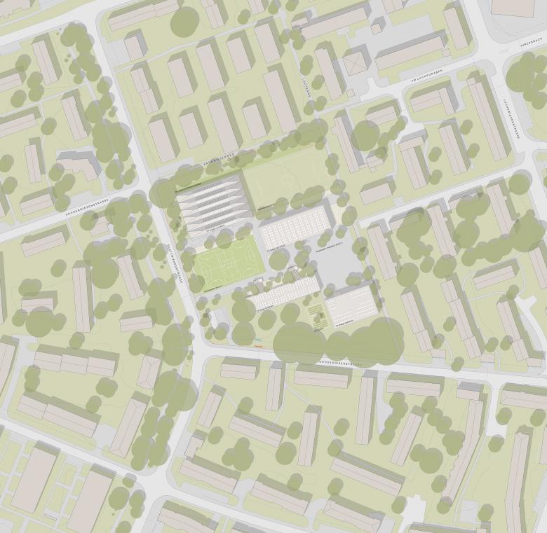 Der von grossen Bäumen gefasste Schulcampus Luchswiesen besteht aus einem lockeren Ensemble mit vier Gebäuden. Zwei Neubauten, das Schulgebäude und die Sporthalle mit dem Ateliergeschoss, ergänzen die bestehenden Trakte A und B und bilden eine neue campusartige Struktur. Jedes der vier Gebäude verfügt über einen eigenen unverwechselbaren Charakter mit eigenen spezifischen Qualitäten, die FAB FOUR. Die städtebauliche Setzung der Gebäude schafft dabei eine Abfolge von grosszügigen Freiräumen, welche sich nahtlos in die Struktur der fliessenden und durchgrünten Aussenräume im Sinne der Steinerschen Gartenstadt einfügen.