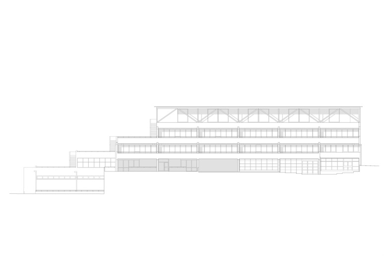 Si compone di un’intelaiatura strutturale che ne definisce l’aspetto formale – e di fatto la facciata – e di uno spazio riscaldato arretrato rispetto al perimetro che determina due zone che riprendono il ritmo e la disposizione planimetrica dei piani sottostanti: un’area a Sud adibita ad orto o terrazza verde e uno spazio coperto verso Ovest in relazione con la sala modulabile del doposcuola.
