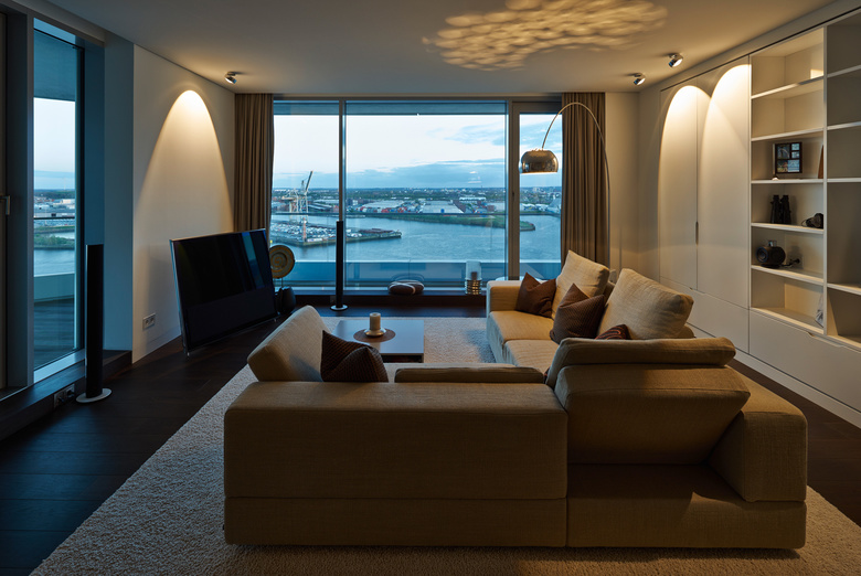 Die Wohnung 58 im 15. Obergeschoss des Wohnturmes wurde gemäß den Traumvorstellungen der Käufer hochwertig ausgebaut. Entstanden ist eine, der amorphen Formensprache des Turms entsprechende, fließende Raumabfolge, in der sich verschiedene Funktionsbereiche vom Entree, über den Wohn- und Essbereich bis hin zum Schlafzimmer wie selbstverständlich überlagern. Die geschwungenen Wände, in die zahlreiche Elemente integriert sind, dienen hierbei zugleich als verbindende und als zonierende Elemente. Schränke, Regale, Garderobe und die Küche sind unter anderen Funktionen als flächenbündige Einbauten konzipiert, wodurch die Flächen optimiert genutzt werden, ohne den Raumfluss zu brechen. Raumhohe, in Wandnischen oder Wandenden stehende Türen können bei Bedarf einzelne Bereiche der Wohnung von dem Raumgefüge trennen, wodurch trotz der größtmöglichen Offenheit auch Rückzugsmöglichkeiten für Eigentümer und Gäste entstehen. Nebenräume, wie die Bäder, ein Hauswirtschaftsraum und Stauräume sind am zentralen Kern des Hauses angeordnet. Die Hauptfunktionen gliedern sich um diesen starken Rücken herum an der Fassade entlang, was zu einer einzigartig uneingeschränkten Wahrnehmbarkeit des Hamburger Hafen-Panoramas führt. Die gedeckte, warme Farbe dieses eingestellten Volumens führen in Kombination mit dem dunklen Eichenparkett und einer gezielten Lichtplanung zu einer besonders behaglichen Atmosphäre. Lichtvouten, die die steigende Raumhöhe nutzen und die Neigung des Daches bewusst inszenieren, betonen hierbei die geschwungene Formensprache und erzeugen starke, dynamische Raumsituationen.