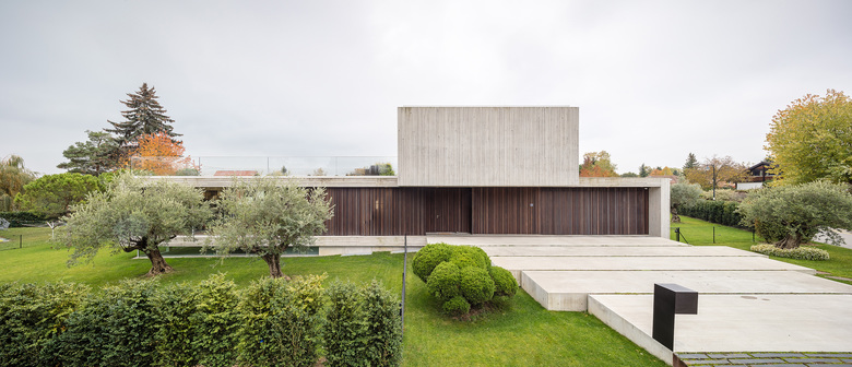L’expression des porte-à-faux structurels, du béton coffré en lambourdes brulées ainsi que de la façade en cèdre foncé, confère à cette villa un langage brutaliste et contrasté.