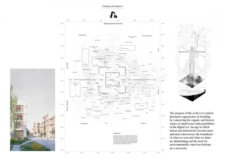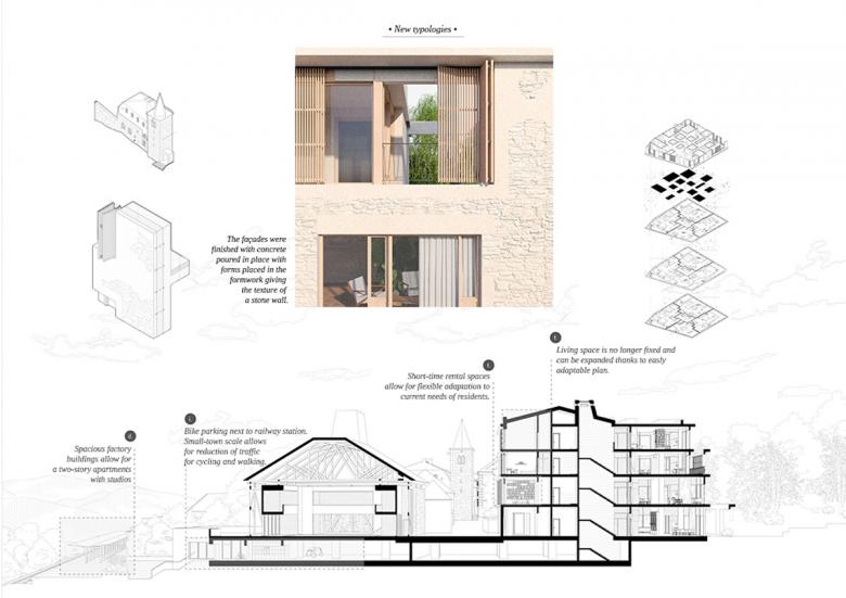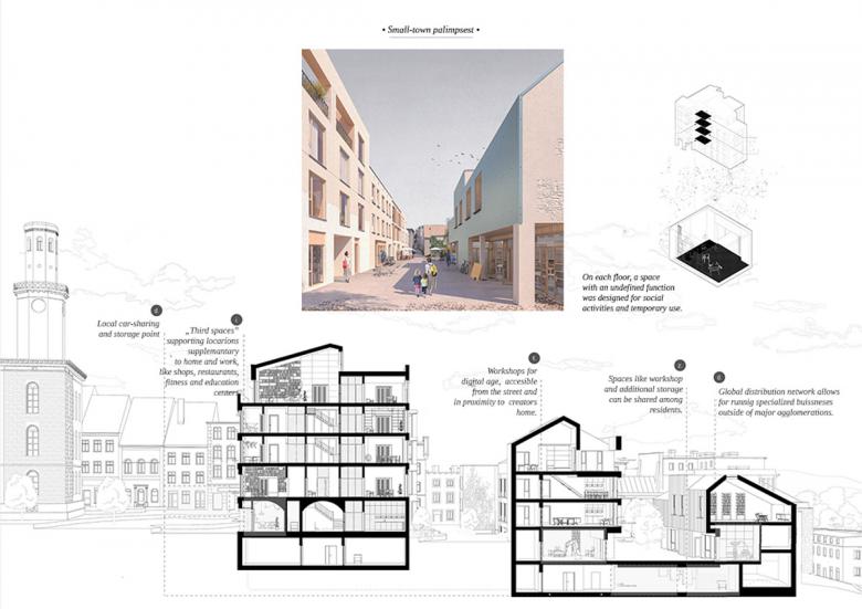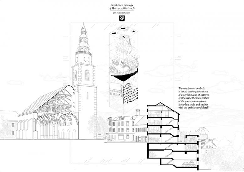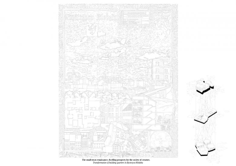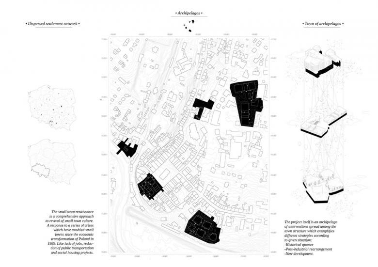 In an age of digitalization, work from home and in the broad sense means of Internet connectivity, the modernist understanding of a house as a space of rest and privacy and workplace as a remote location detached from our dwelling become obsolete. As architects we should look for alternatives at a bigger scale than a functional home with an office but rather new settlements accessible for all kinds of people. The timeless values of small-town complexes and how modern solutions in the field of communication, logistics and management constitute a unique opportunity for a renaissance of small towns. The specific time resistance, responsible for the phenomenon of the invariability of the image of a small town, requires taking actions that are resistant to changes in economic and social conditions. Those ideas have been interconnected with the needs and achievements of emerging digital society. Bystrzyca Kłodzka was selected for the project development area - a city located in the Kłodzko Valley with a well-preserved mediaeval structure. The design process was based on the idea of urban archipelagos constituting a scattered and comprehensive action plan for small towns through point architectural interventions, changing patterns of human behaviour and enabling the emergence of new ways of living and working. The three proposed activities include three parts of the city showing different design approaches: the market quarter, the reconstruction of the post-industrial area and the city transfer point. The living and working environment thus achieved contains a wide spectrum of spaces with different levels of privacy and ownership structures defined as hybridised intermediate states. All of the proposed interventions provide housing units which can be expanded thanks to unassigned joker rooms that can be used as home office, additional room or community space.
