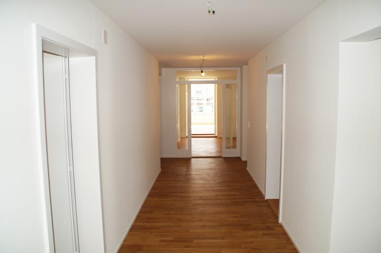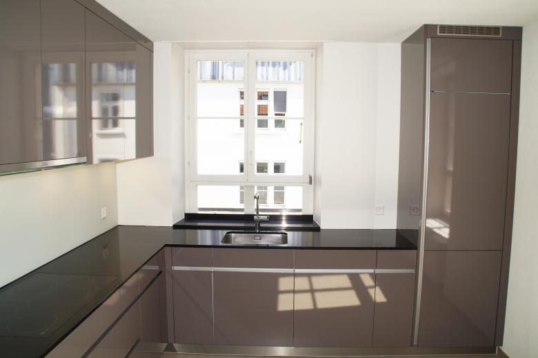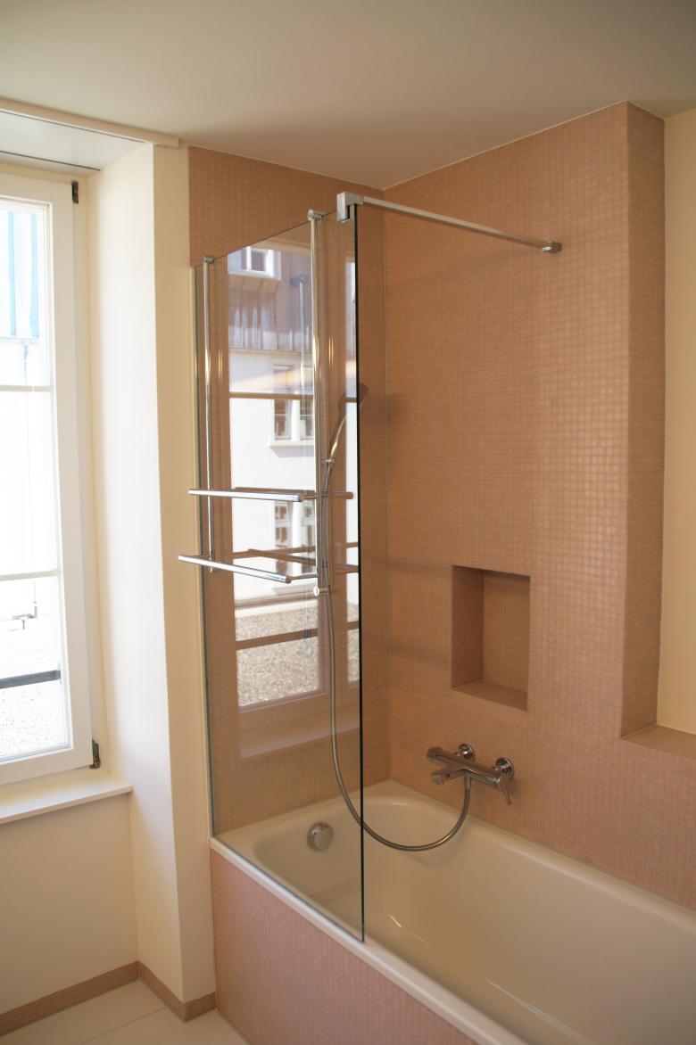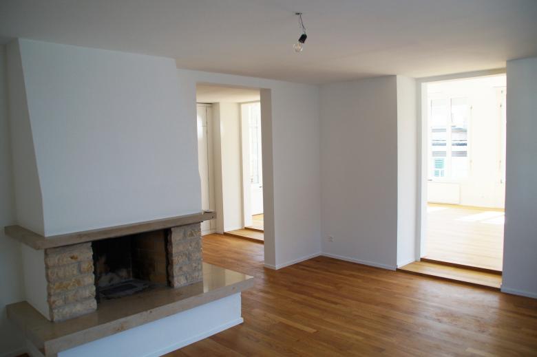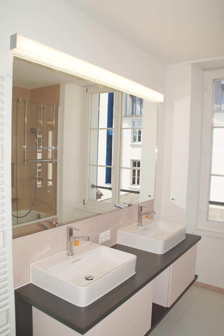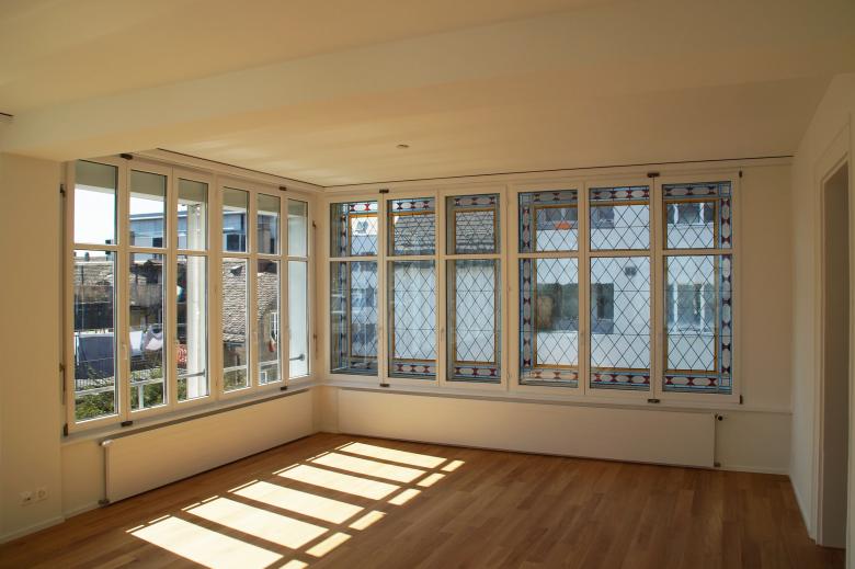 Die einstige Industriellenvilla wurde bereits vor Jahren in Büros und Wohnräume unterteilt. Nach drei Jahrzehnten war nun eine Renovation der Wohnung im 2. Obergeschoss erforderlich. Alle Nasszellen wurden modernisiert und erneuert, während die übrigen Oberflächen behutsam saniert oder instand gesetzt wurden.