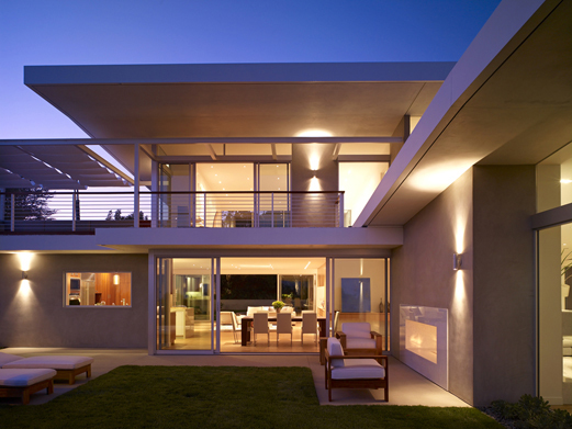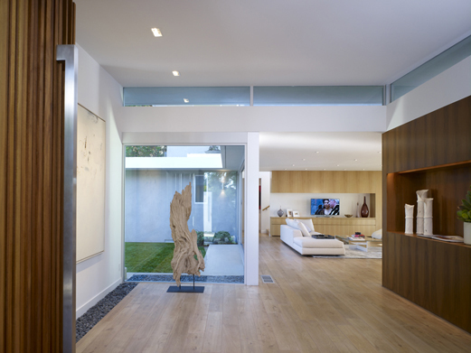 While also capturing 270-degree views of downtown Los Angeles and the Pacific Ocean, this massive foundation-up renovation and second-story addition floods the once-dark interior with natural light and creates indoor-outdoor environments throughout. Floor to ceiling windows combine with natural ipe decks and rooftop rock gardens to extend view corridors and habitable areas at the south and west elevations. The lifted ceiling and custom two-sided stone fireplace create a continuous great room between the living and dining areas and main garden. The newly-added second story offers a separated haven for extended family, including mini-kitchen and secondary family room. Light-colored, beach-inspired materials such as white-washed oak floors, white stone, teak millwork, and ocean-toned glass tiles transform the home into a tranquil, airy Southern California retreat.