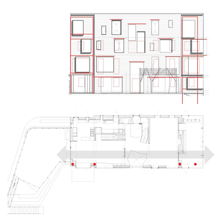 The Rock Creek House is an adaptive re-use project of a 1920’s brick structure that was originally composed of two floors, with a mechanical basement and attic. This adaptation leverages the robustness of the existing structure to capture the attic and basement to double the house’s size, while expanding its functions into the landscape. While the northern street façade remains relatively intact --formal, insular, and composed-- the southern exposure to Rock Creek is made more generous. By expanding the areas of glazing and establishing a more precise relationship between rooms and their respective apertures, a new architectural order is established on the south – more informal, open and in dialogue with nature.