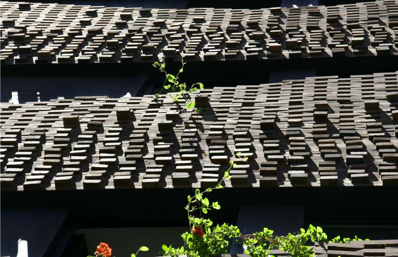 as the result is thought to be one unified object, habibeh madjdabadi and alireza mashhadimirza intentionally avoided designing different components separately. instead, the aesthetic is defined by a series of loose rules that allow both sides of the repeated units to be visible. from the outside, they appear as an integrated texture, and from the inside, they appear as window parapets embedded into the masonry. also, a standard cube geometry is used at various scales: in the protrusions of the outer surface, in planters of the fencing, and in shelves of the interior.