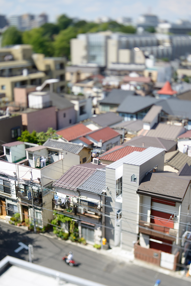 文京区根津の木造住宅が密集した街区にある間口3600/奥行8300のわずか9坪の敷地。 普段何気なく見過ごしている家と家の隙間。 その小さな都市の外部空間に、コンパクトな都市住宅が持ちきれない生活環境としてのつかいかたを発見しよう。
