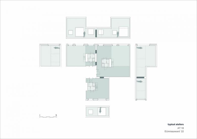 The Atelierhaus C21 therefore dissolves the typical limits of „work space“ and „living space“ and offers as a building type a neutral framework for various activities and visions of how to work or live or both, which the user shapes and forms into images of how to use the space on his or her own. As individual units from 40 to 120m² or combined into nearly unlimited space throughout the building, the ateliers create a spatial and technical place for freelancers, craftpersons, artists and small producers as well as for anyone, who seeks a open and flexible spatial structure for living. All three types, A, B and C, have a sanitary module as an elementary “core” with toilet, shower, wash basin and connections for a washing machine as well as for a small kitchen. The typical ceiling height is 2,70m and in the B and C types it is 5,70m in the main area. In addition to the 84 ateliers sold as condominiums, there are a roof terrace, spacious landscaped areas, and the foyer with salon on the ground floor free for open use by the building community. Operational support for the house community is provided by a small café and a gallery.