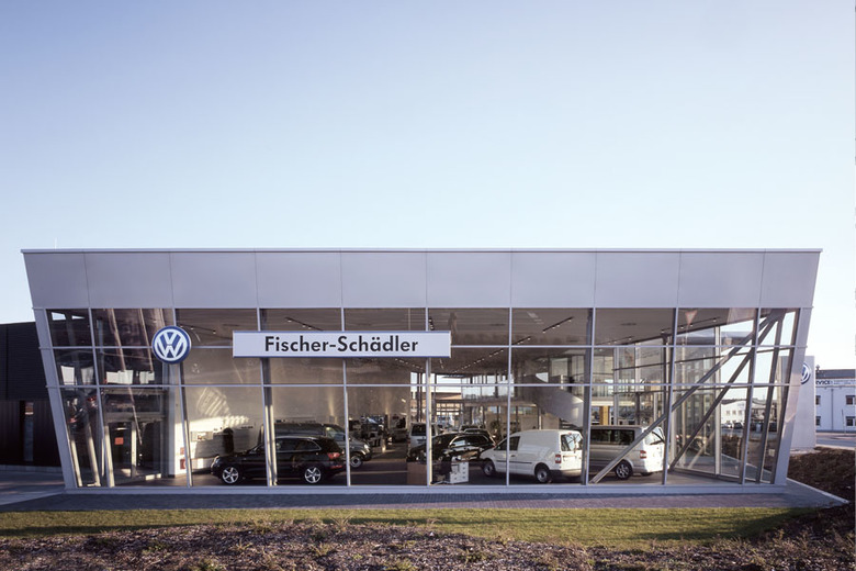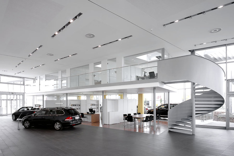 Die beiden transparenten Baukörper sind stadträumlich ablesbar, im Innern ergeben sich zwei spannende Ausstellungsbereiche mit Straßenfluchtwirkung. Der eine verjüngt sich perspektivisch, der andere öffnet sich in die unverbaute Landschaft. Die hohen Decken, auf denen sich die Leuchten wie Straßenmarkierungen abzeichnen, verstärken diesen Eindruck. Beide Ausstellungsräume sind durch eine eingestellte, transparent gestaltete Galerie voneinander getrennt. Der Kundenempfang und die offenen Verkäufer-Arbeitsplätze befinden sich im Erdgeschoss, die verglasten Büros der Sachbearbeiter und Geschäftleitung im Obergeschoss.
