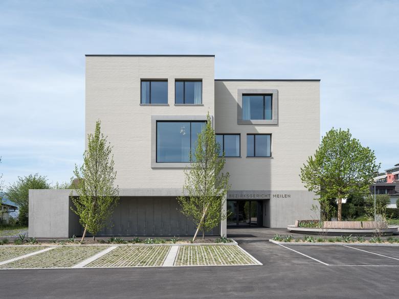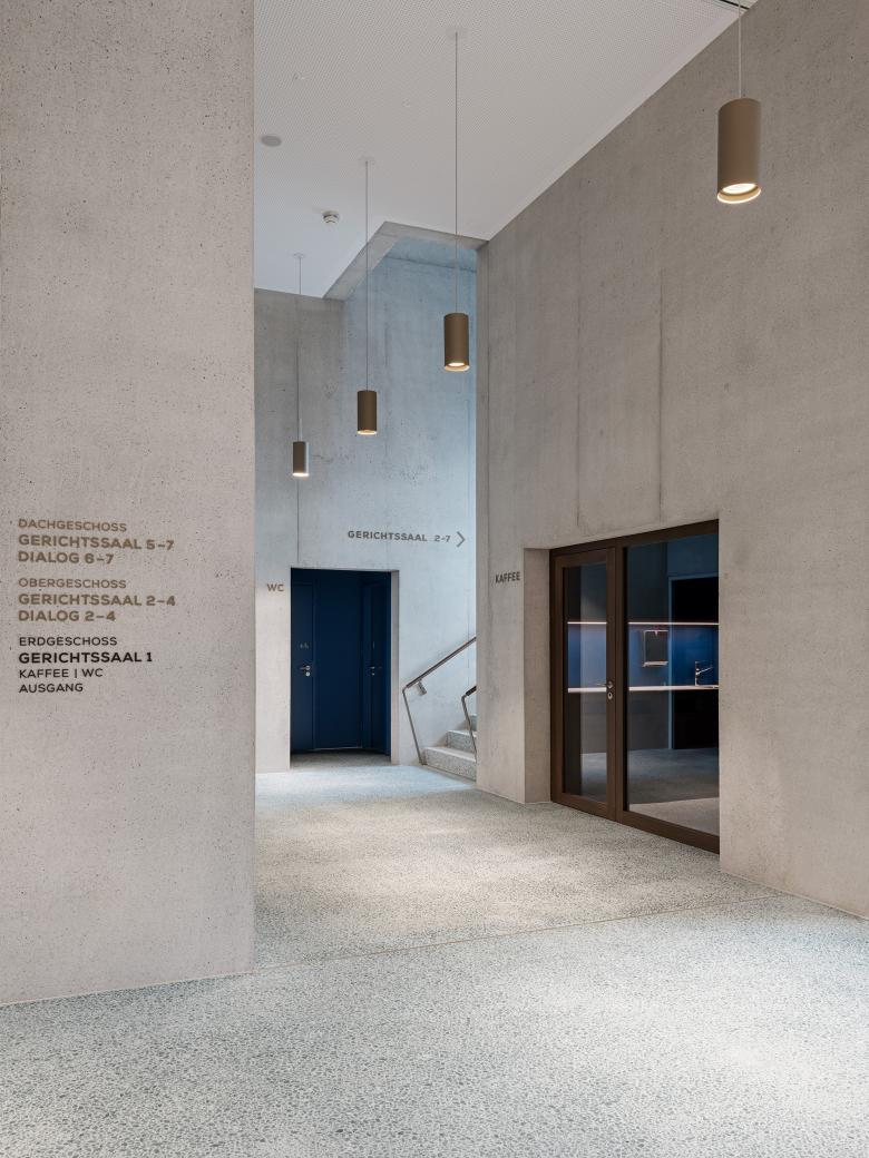 Der dreigeschossige Baukörper bildet die neue Adresse für die publikumsintensiven Gerichts- und Verhandlungssäle. Das neue Bezirksgericht ruht solide und souverän auf der Geländeterrasse entlang der Unteren Bruech Strasse. Die präzise Setzung und die situativen Rücksprünge nehmen Bezug und Rücksicht auf die Nachbarschaft. Die Gestik der allseitig orientierten Fassade verleiht dem Bezirksgericht einen identitätsstiftenden Ausdruck. Über den einladend gestalteten Zugang betritt der Besucher das Bezirksgericht. Die Erschliessungszonen sind nischenartig gegliedert und formen die Wartebereiche als Rückzugsmöglichkeiten für Parteien und Publikum. Die Gerichtssäle werden ruhig und zurückhaltend konzipiert: Die Holzverkleidungen und Ausstattungen ermöglichen sachliche Verhandlungen in atmosphärisch angemessenen und trotzdem funktionalen Räumen.