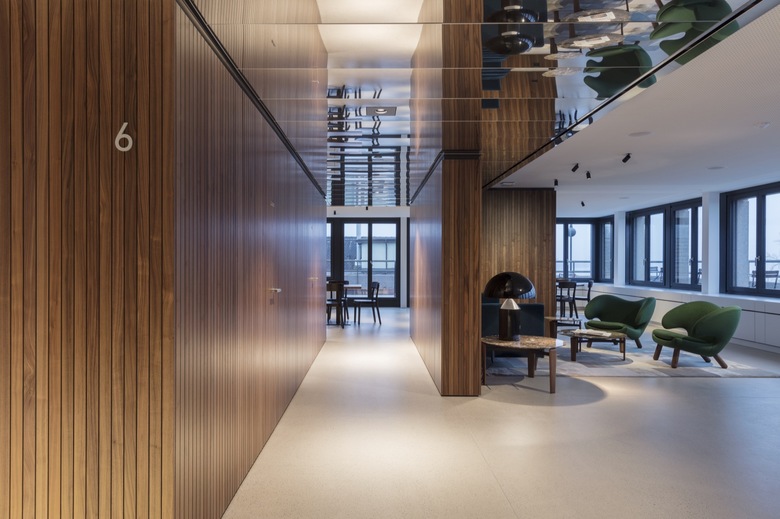 Einfache, aber edle und beständige Materialien wie Terrazzo, Anhydrit und Teppich, Nussbaumverkleidungen an den Wänden, schwarzes Glasmosaik in den Nasszellen und feingliedrige Glastrennwände bestimmen den Mieterausausbau. Als gestalterische Berater wurde ein Team der Hürlemann AG beigezogen, welches unter anderem für den Steintresen im Foyer sowie für ausgewählte Möbel und Leuchten verantwortlich zeichnet.