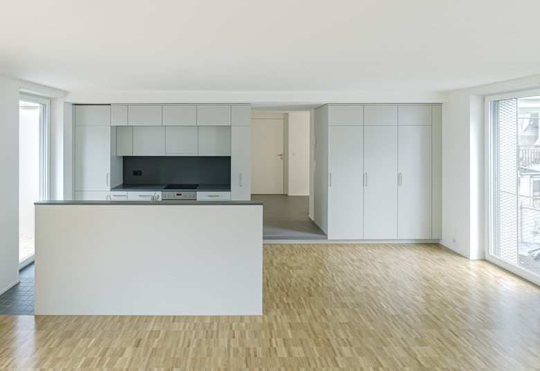 Die Erneuerung der Küche und Bäder basiert auf dem Konzept möglichst keine Innenwände zu verschieben. Dabei stellt der kompakte Grundriss die zentrale Herausforderung dar. Die haustechnischen Leitungen müssen auf engstem Raum koordiniert werden. Ein neuer Schacht für die Sanitärleitungen liegt in der Flucht der Einbauküche an der Aussenwand. Die horizontale Erschliessung wird durch eine Vorsatzschale im Bad gewährleistet, welche auch den Spülkasten aufnimmt. Dieses Element wird nur einen Meter hoch, damit das kleine Bad räumlich nicht weiter eingeschränkt wird. Neben dem Kücheneingang liegt der Schacht für die Abluftleitungen. Die neue Einbauküche kann so präzis auf Mass vorgefertigt und rasch am Bau montiert werden.