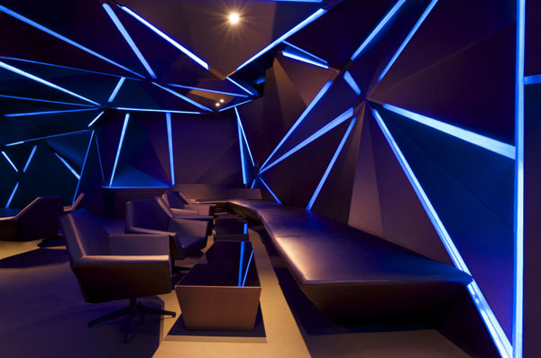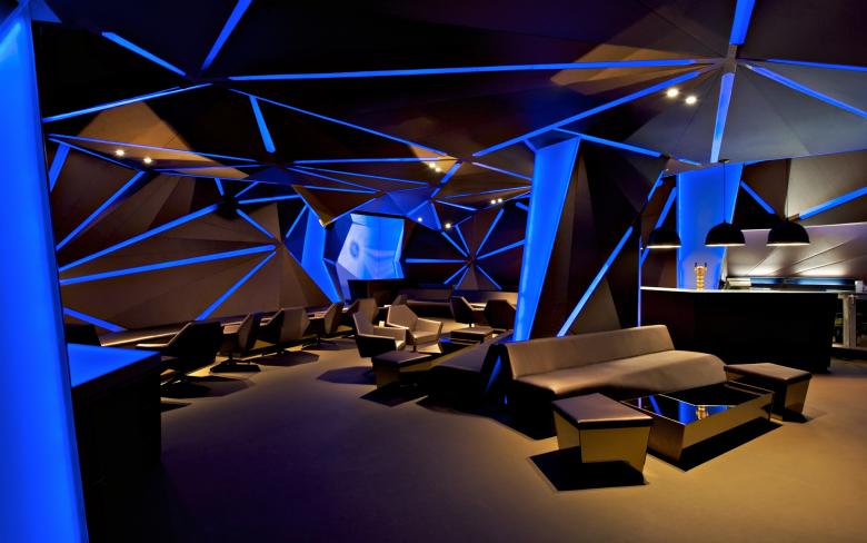 Central to the theme of the bar is the creation of an over scaled and highly faceted structure that boldly references the multiple facets of a black diamond; the idea is abstracted by creating a dramatic faceted labyrinth that dynamically and unpredictably envelopes the entire space. Seating moulds into walls and then onto the ceiling.