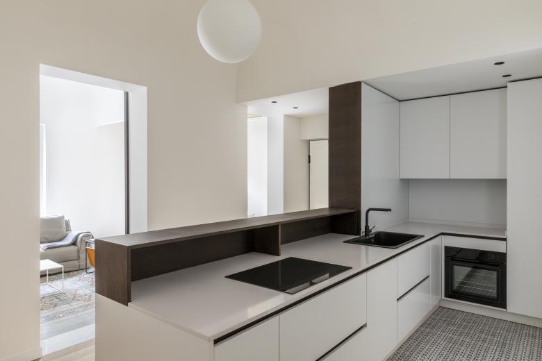L’impianto della casa, viene ricondotto al suo stato originale attraverso una serie di demolizioni che consentono nuovamente di leggere in successione gli ambienti passanti della casa, caratterizzati da alti soffitti con volte a padiglione. All’ingresso viene inserito un sistema su misura, da un lato contenitore e dall’altro cucina disposta a penisola. L’articolazione a L in altezza del mobile, fatto in legno laccato e rovere, scherma dal salotto lo spazio lavoro della cucina ed instaura una relazione visiva fra i due ambienti. Nella zona giorno i nuovi interventi sono stati ridotti al minimo, lavorando più sul recupero degli elementi dati: