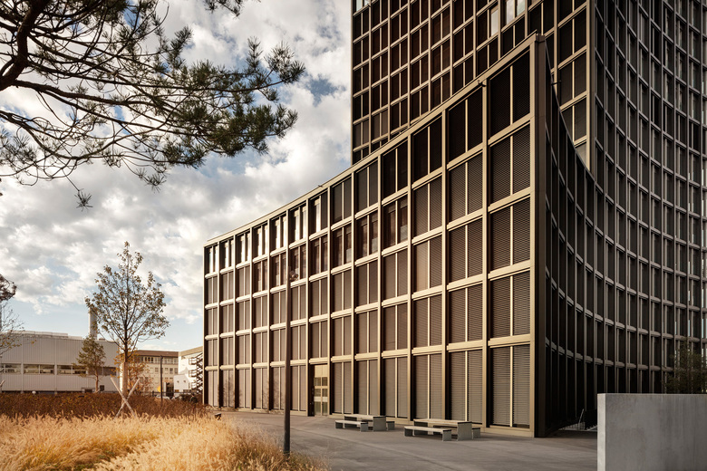 Der Ceres Tower steht mit einem "breiten Fuss" am Boden, bildet auf 21 Metern auf der Höhe der benachbarten Gebäude eine erste Traufe aus und wächst weiter in konkaver, expressionistischer Form bis zu einer auskragenden Krone. Mit der Gliederung in Sockel, Schaft und Attika knüpft die Architektur des Ceres Towers an klassische Vorbilder wie das Rockefeller-Center an. Die metallische Fassadenverkleidung der Stützen und Geschossdecken ist in einem dunklen Bronzeton gehalten und erinnert an die ursprüngliche Tradition der örtlichen Guss-Industrie. Der Charakter des langestreckten Gebäudevolumen von Ceres Living wird durch eine horizontale Gliederung der Fassaden noch verstärkt. Die Bänder sind in einem dunklen und einem helleren Grauton mit Grünabtönung gehalten. Als Kontrapunkt sind die Untersichten der Balkone in einen leuchtendem gelb hervorgehoben.