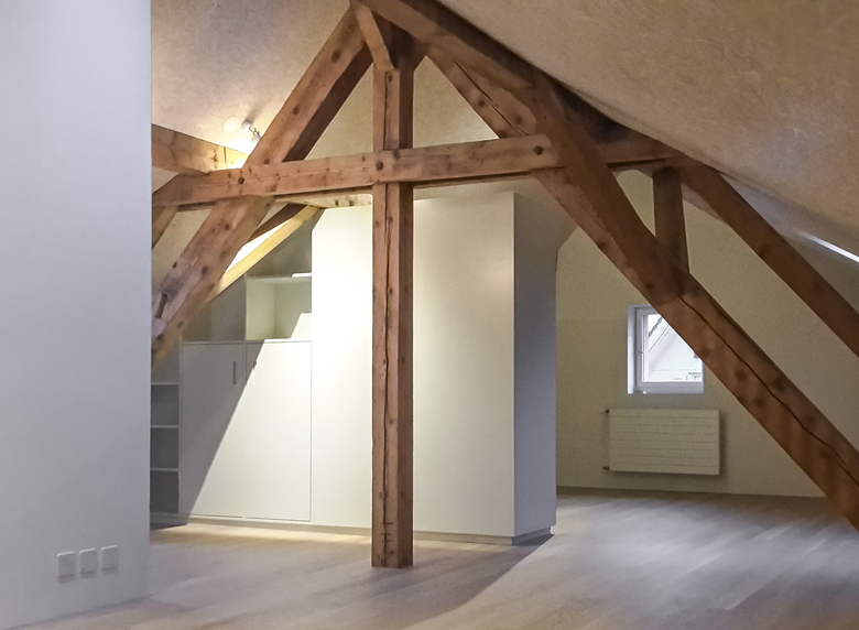 Im denkmalgeschützten Haus an der Obergrundstrasse konnten die Estriche aufgehoben werden, sodass ein grosser, offener Dachstock zu einem Ausbau zur Verfügung stand. Im Vordergrund des Eingriffs stand das Freilegen der beeindruckenden Holzkonstruktion.