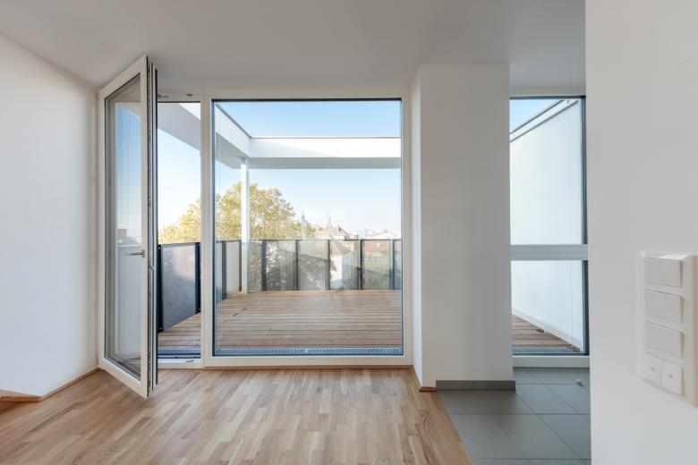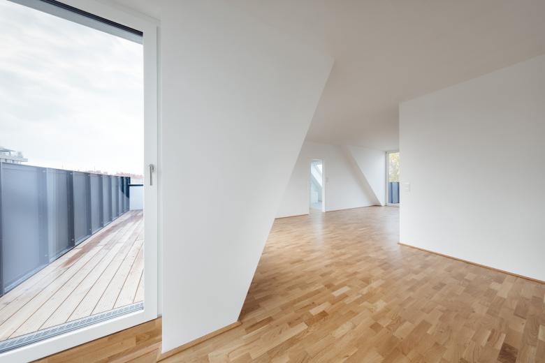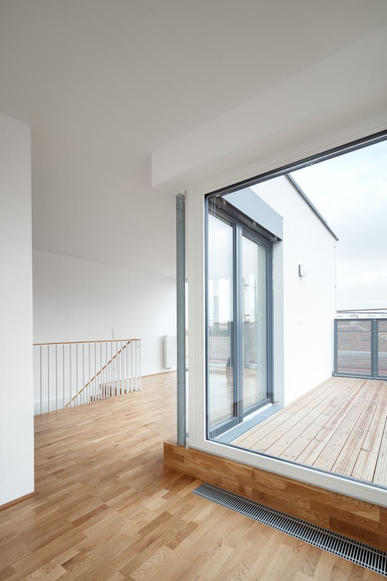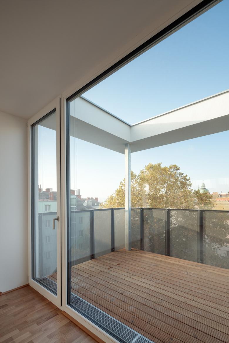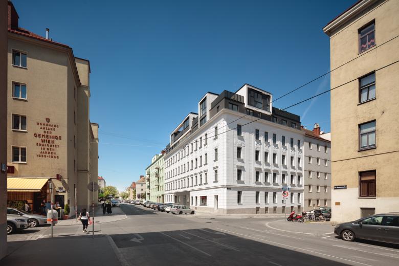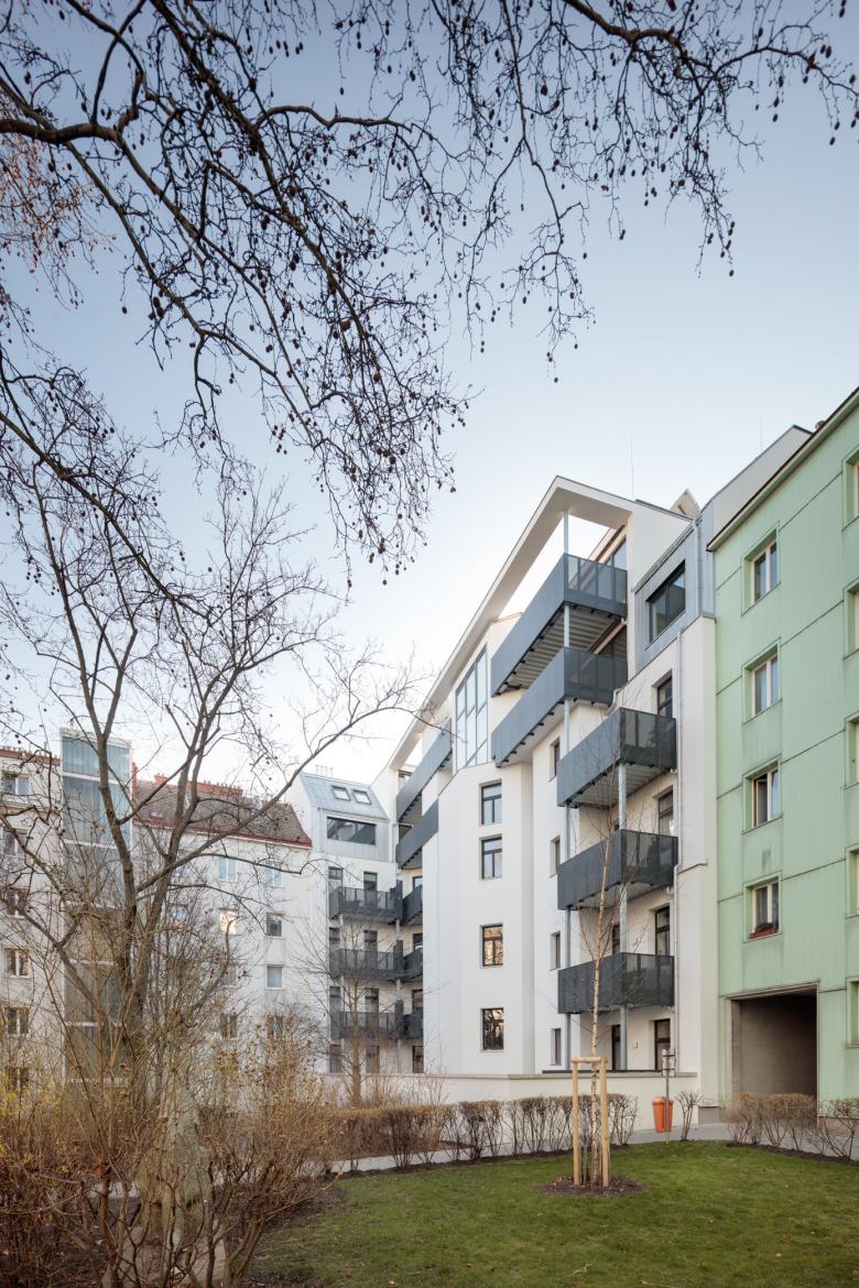 Sieben Wohnungen blieben gleich, die restlichen 28 wurden saniert und zum Teil zusammengelegt. Hinzu kamen neun weitere in den beiden neuen Obergeschossen. Die Anzahl der durchgesteckten Wohnungen beläuft sich nun insgesamt auf 36. Ihre Grundrisse variieren zwischen 40 und 102 m2. Hofseitig erhielten sie großteils Balkone bzw. Loggien, zwei vom Stiegenhaus zugängliche Loggien dienen der allgemeinen Nutzung. Durch eine Rampenanlage im Erdgeschoss und den nachträglichen Einbau eines Liftes sind alle Wohnungen barrierefrei erreichbar. Ein großzügiger Fahrrad- und Kinderwagenraum, eine Briefkasten-Durchwurfanlage, sowie ein Müllraum mit straßenseitigem Service-Zugang komplettieren den Wohnbau.