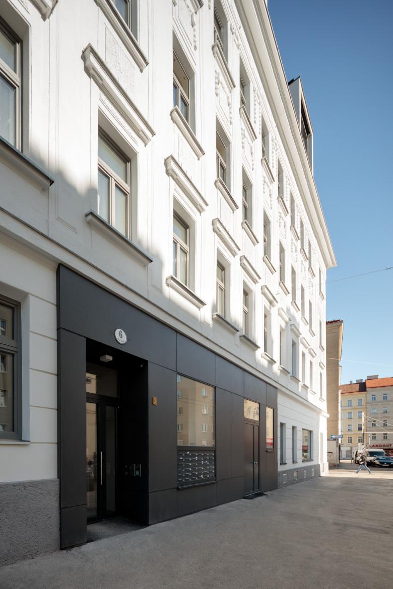 Mehrere leerstehende Substandardwohnungen ermöglichten an der Ecke Troststraße/Rechberggasse eine geförderte Sockelsanierung. Unter vollständiger Ausnützung der Regelung für Gaupen erhielt das in die Jahre gekommene Zinshaus ein zurückspringendes 4. Obergeschoss sowie ein Dachgeschoss. Alt und neu verbinden sich zu einem harmonischen Ganzen – so liegen etwa die neuen Gaupen genau in den Achsen der alten Fassade; ihre Farbgebung nimmt das Grau des nun aufgewerteten Eingangs im Erdgeschoss wieder auf. „Natürlich muss man das Neue vom Alten unterscheiden können. Es sollte sich ein spannender Kontrast ergeben, aber alt und neu dürfen sich nicht bekämpfen,“ so P.GOOD.